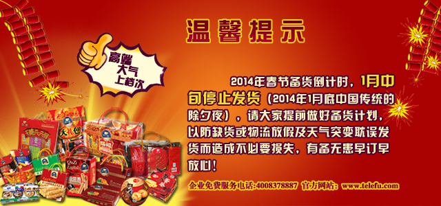 關(guān)鍵詞:春節(jié)前夕截止發(fā)貨通知 溫馨提示:2014年春節(jié)備貨倒計(jì)時(shí),1月中旬停止發(fā)貨(2014年1月底中國(guó)傳統(tǒng)的除夕夜),請(qǐng)大家提前做好備貨計(jì)劃,以防缺貨或物流放假及天氣突變耽誤發(fā)貨而造成不必要損失),有備無(wú)患早訂早放心!