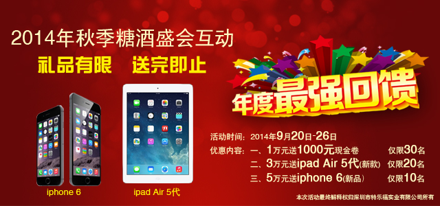唐人福2014年秋季糖酒會iPhone6派送開始啦編輯:唐人福 發(fā)布時間:2014-09-19 15:38:16 瀏覽次數(shù):3204人次